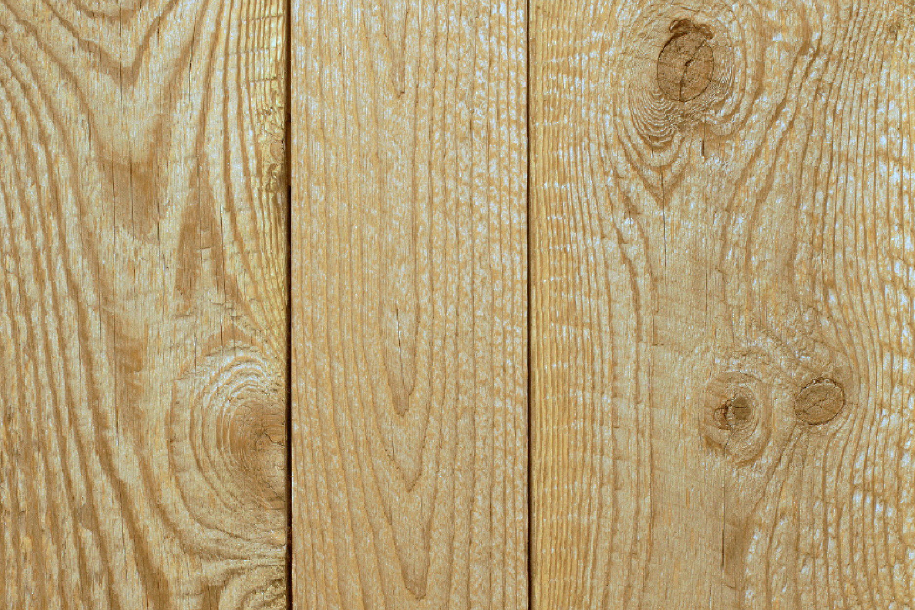 Bois rustique, noeuds traversants présents ou partis, légères fissures, marques d’anciens clous, variation de l’usure de la couleur de la surface exposée.