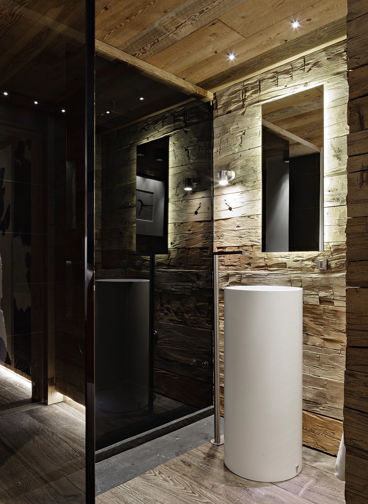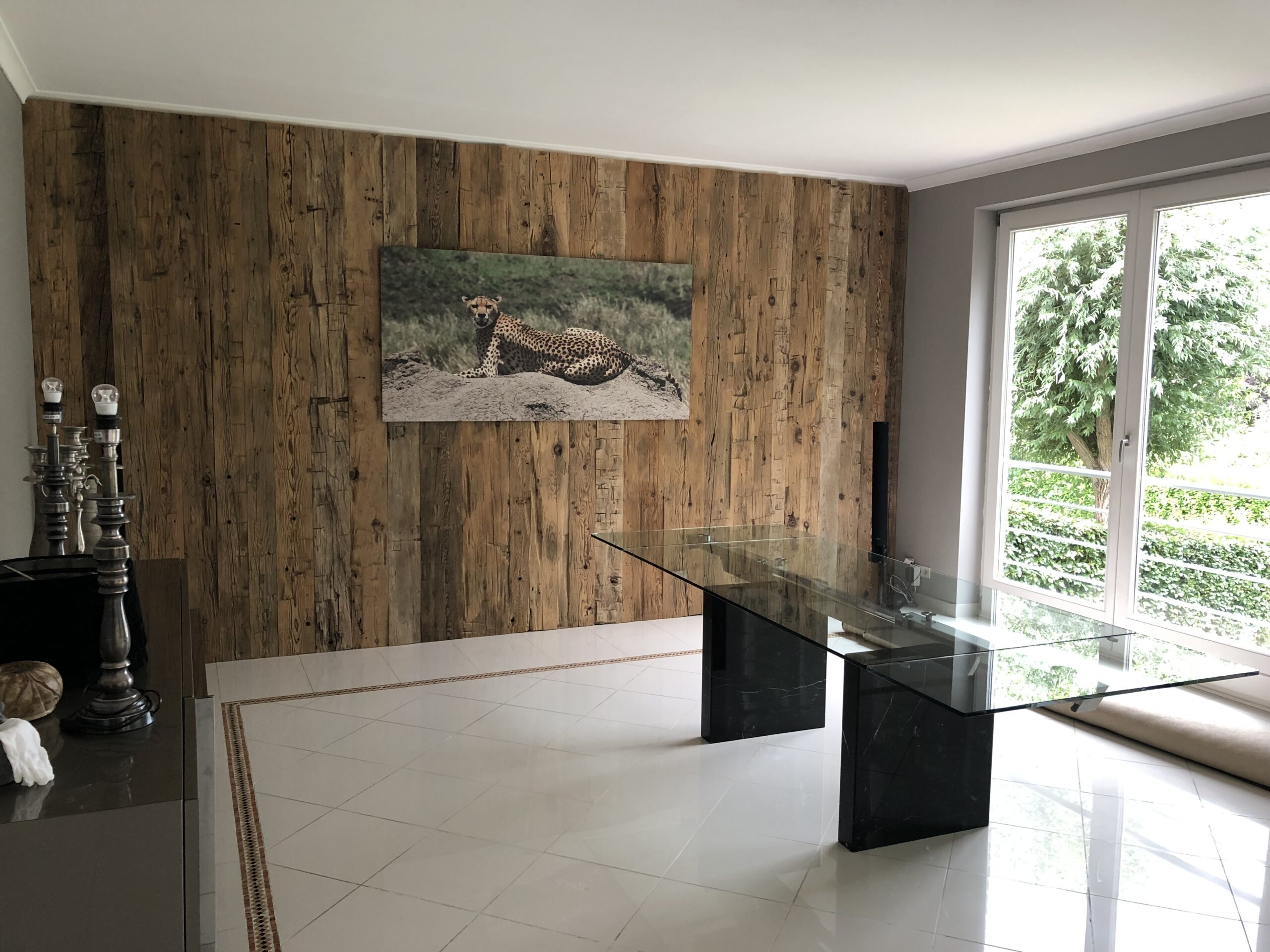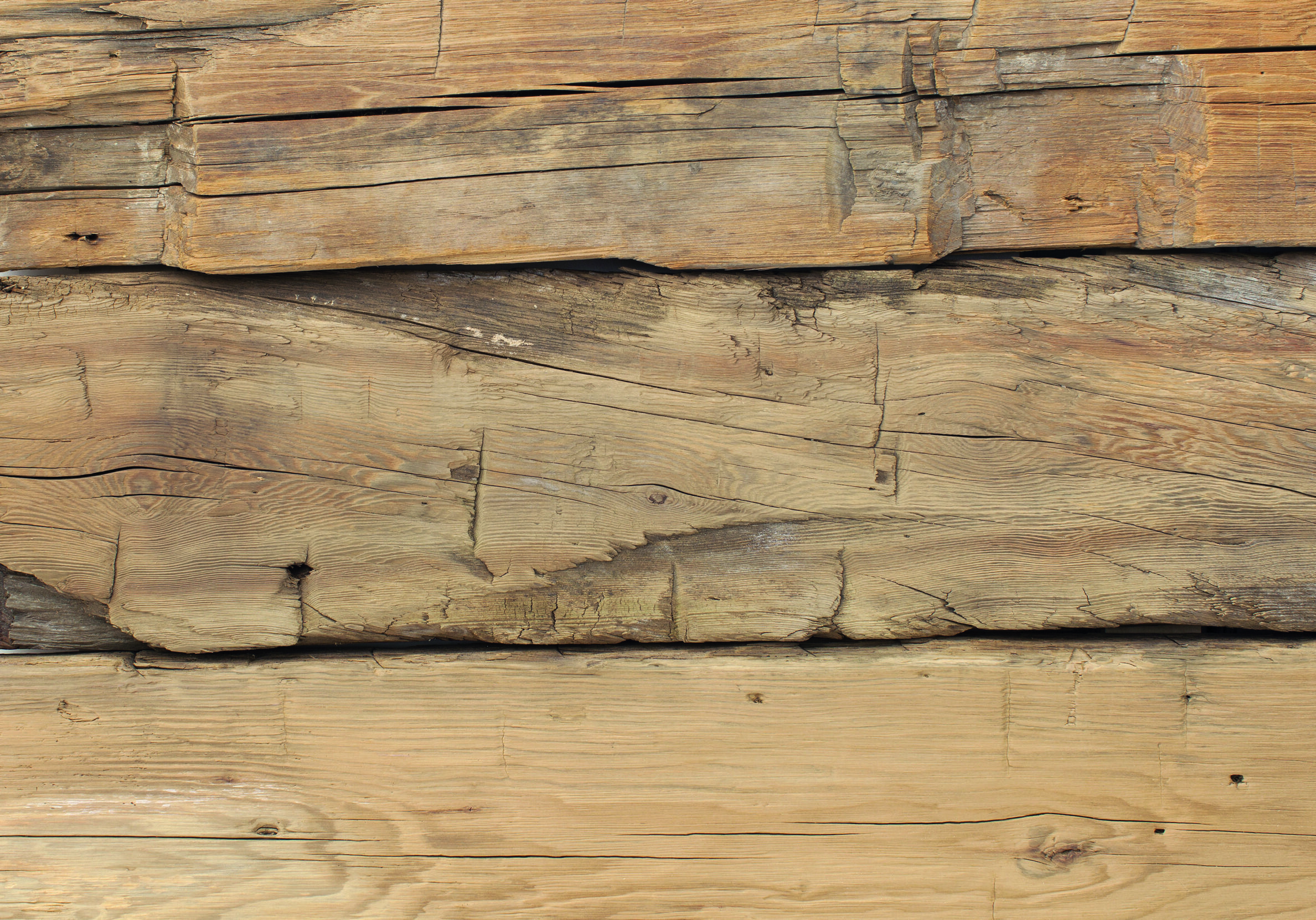 Bois rustique, noeuds traversants présents ou partis, légères fissures, marques d’anciens clous, variation de l’usure de la couleur de la surface exposée.