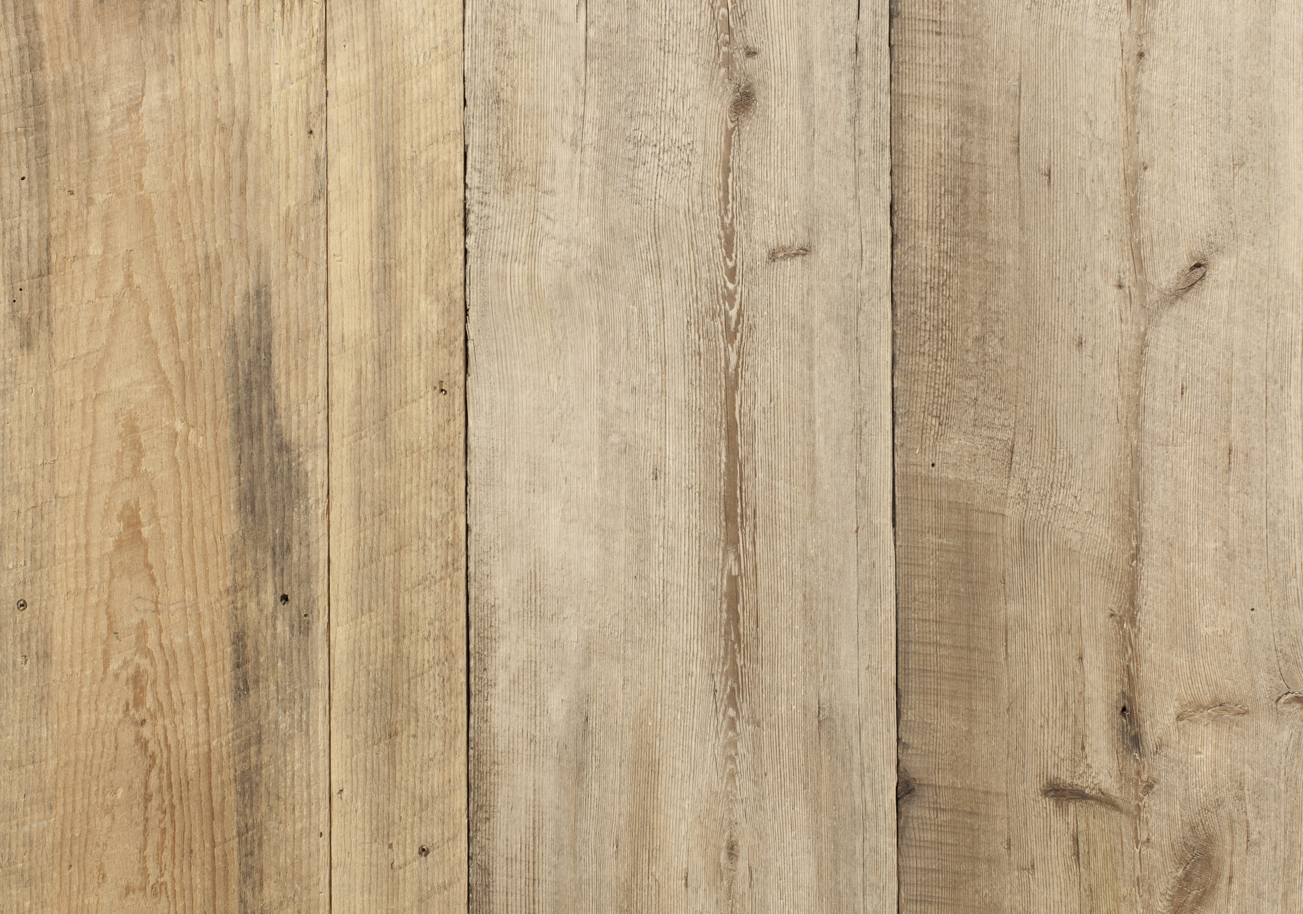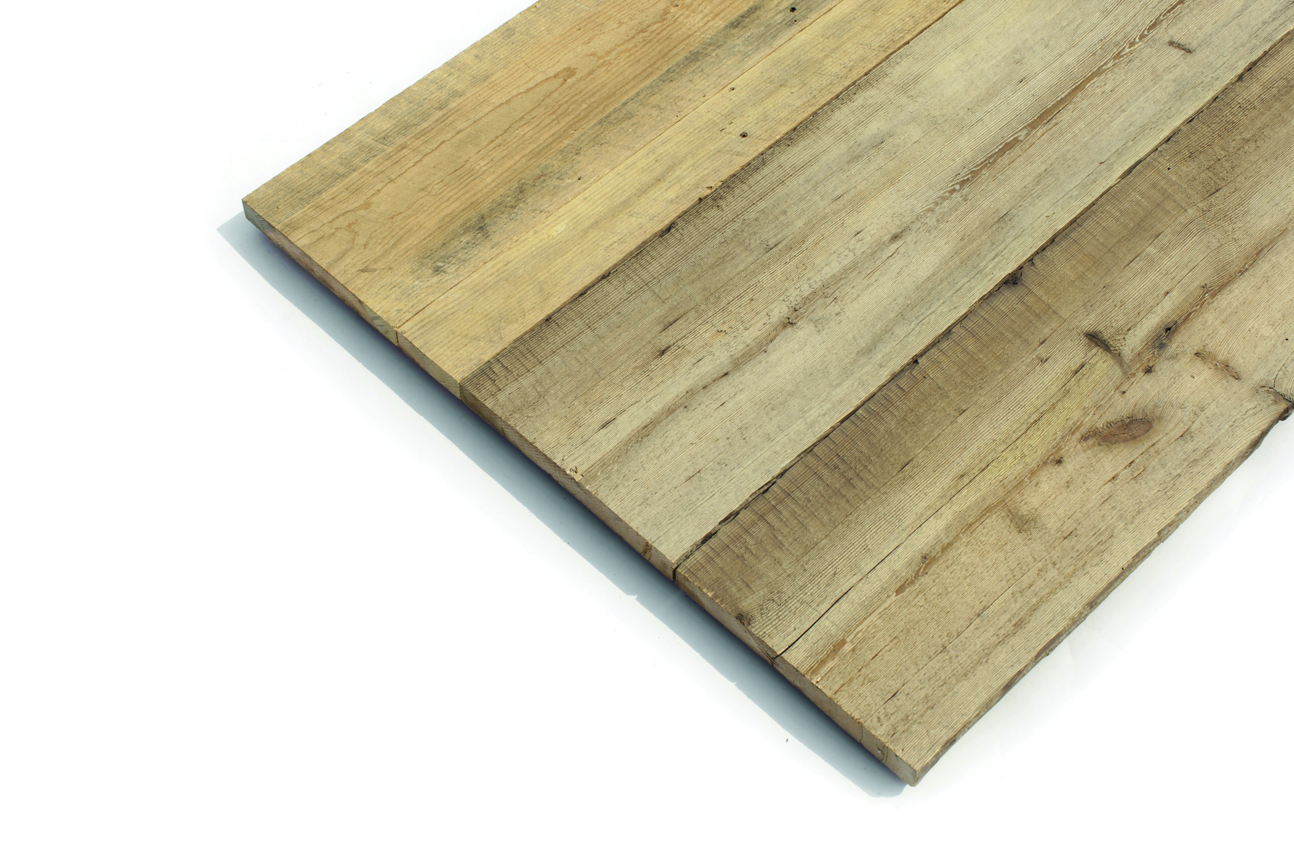 Bois rustique, noeuds traversants présents ou partis, légères fissures, marques d’anciens clous, variation de l’usure de la couleur de la surface exposée.