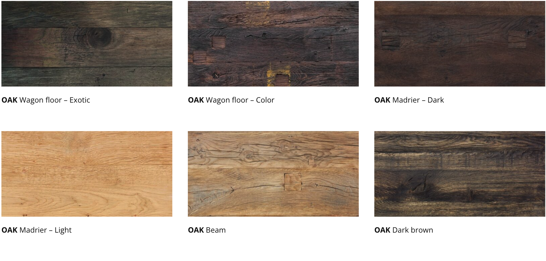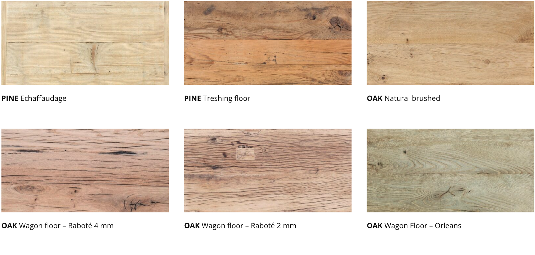FINITION | PIN Echaffaudage, PINE Treshing floor, OAK Natural brushed, OAK Wagon floor – 4mm, OAK Wagon floor – 2mm, OAK Wagon Floor – Orleans, OAK Wagon floor – Exotic, OAK Wagon floor – Color, OAK Madrier – Dark, OAK Madrier – Light, OAK Beam, OAK Dark brown, OAK Smoke – Light, OAK Smoke – Grey, OAK Black |